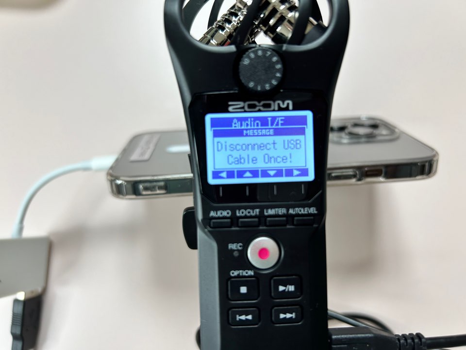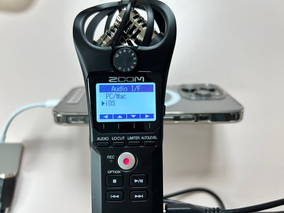 녹음기 오른쪽에 있는 5핀 케이블 연결부분부터 젠더를 연결하여 아이폰까지 연결하면 아래와 같이 뜹니다. 여기서 Audio I/F를 선택합니다. 선택은 화살표시 아래 네가지 버튼을 방향에 따라 눌러줍니다.