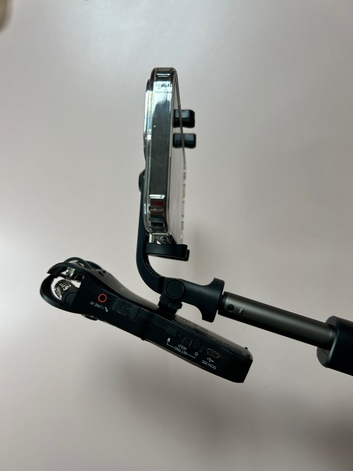 위와 같이 아이폰 외장 마이크로 활용할 경우 한 손에는 아이폰, 한 손에는 녹음기를 들어야 하기 때문에 불편한 상황이 발생할 수 있습니다. 따라서 저는 셀카봉 중에 레코더를 같이 연결할 수 있는 요이치 셀카봉을 구매하였습니다. 모두 연결하면 아래와 같이 되는데 이는 레코더를 보여준 장면으로 실제로 레코더는 아래로 향하게 됩니다.